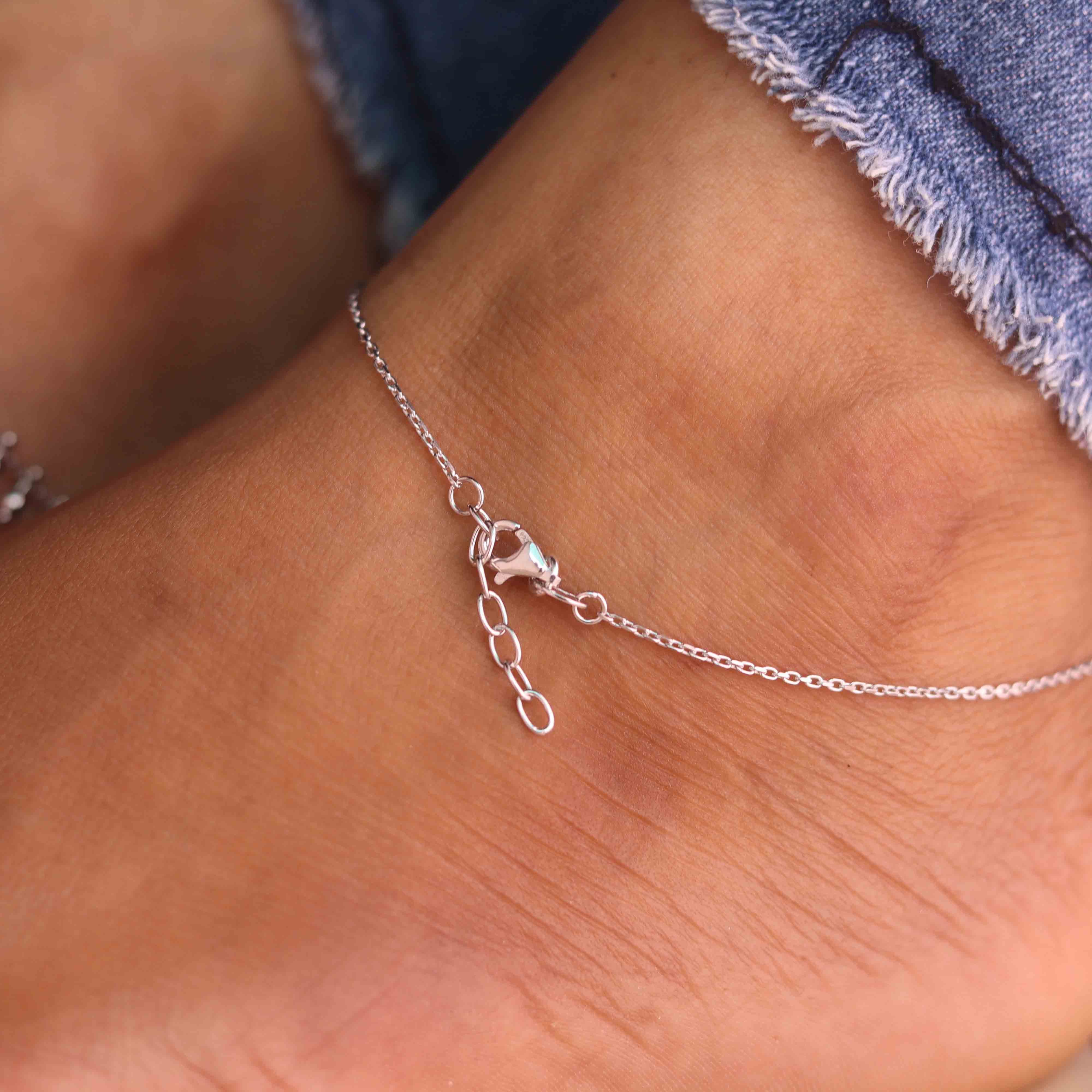 Step into understated luxury with DIA CHARMS ® pure silver Anklet collection – designed to move with you, shine for you, and stay with you.